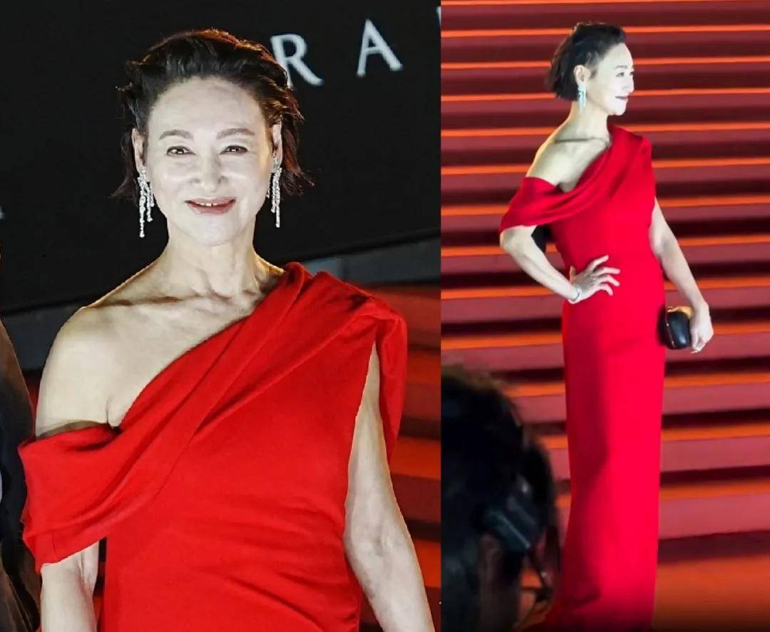跟马丽同剧组的惠英红入围了最佳女配,她穿了一条醒目的红色斜肩长裙,搭配大背头短发,气场十足。
