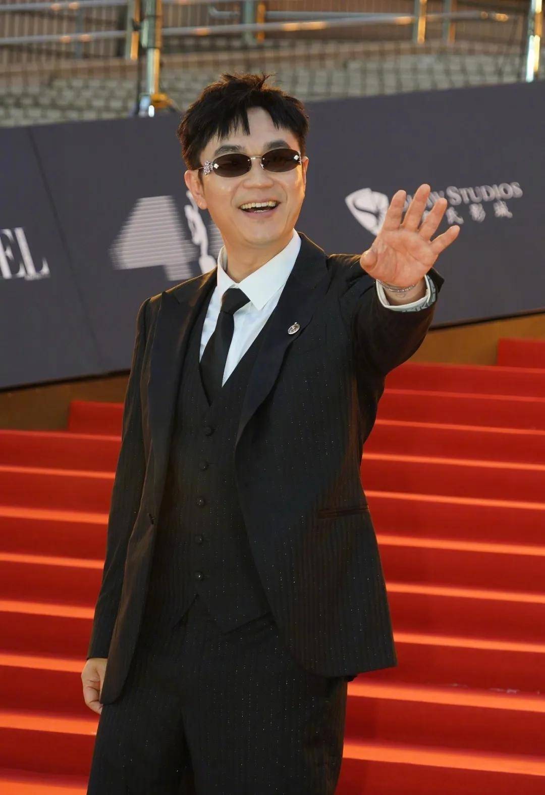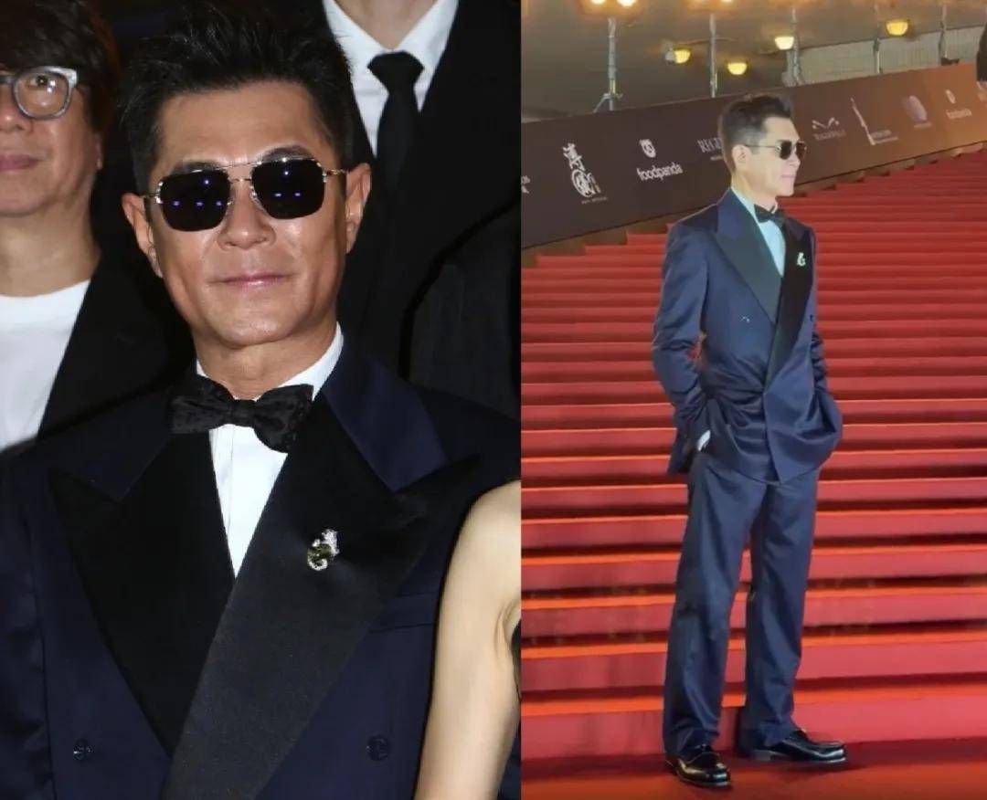 梁家辉穿了一套黑色暗纹西装,墨镜一戴,在阶梯前拍出了一种整个金像奖都由他掌控的大佬气场。