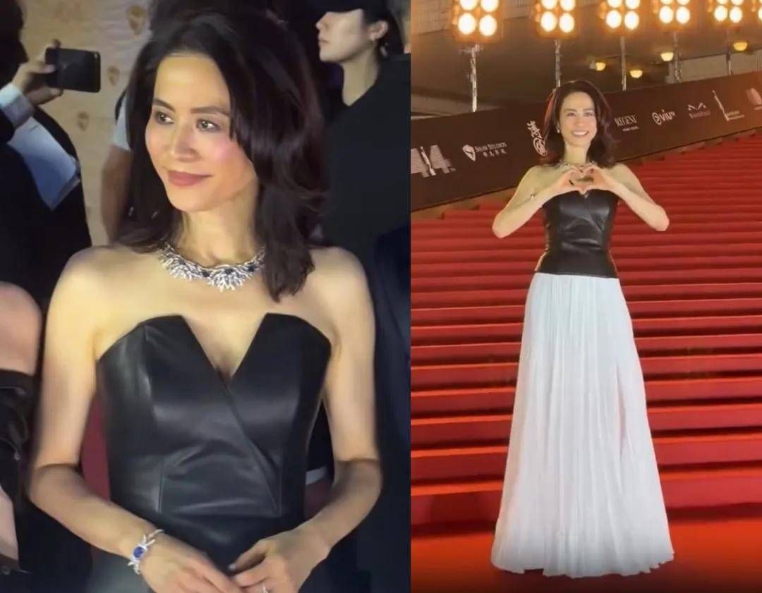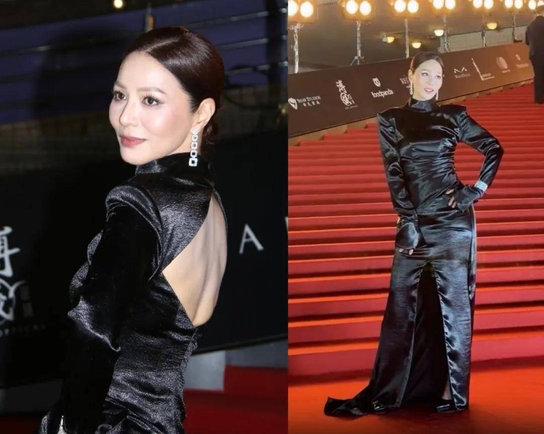 滕丽名穿了一条黑色露背开叉皮裙,妆造审美比之前出席TVB红毯时好太多了,让人梦回她年轻时颜值巅峰的模样。