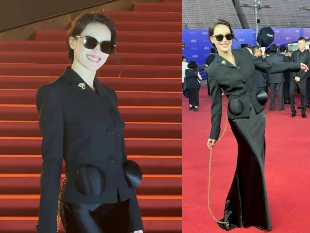 在红毯上从不让人失望的舒淇,戴墨镜、穿全黑裙装也穿出了俏皮的感觉。这套裙装的腰部有一条直连裙摆的金色链子,在她身上不仅不会累赘,反而增添了几分趣味。