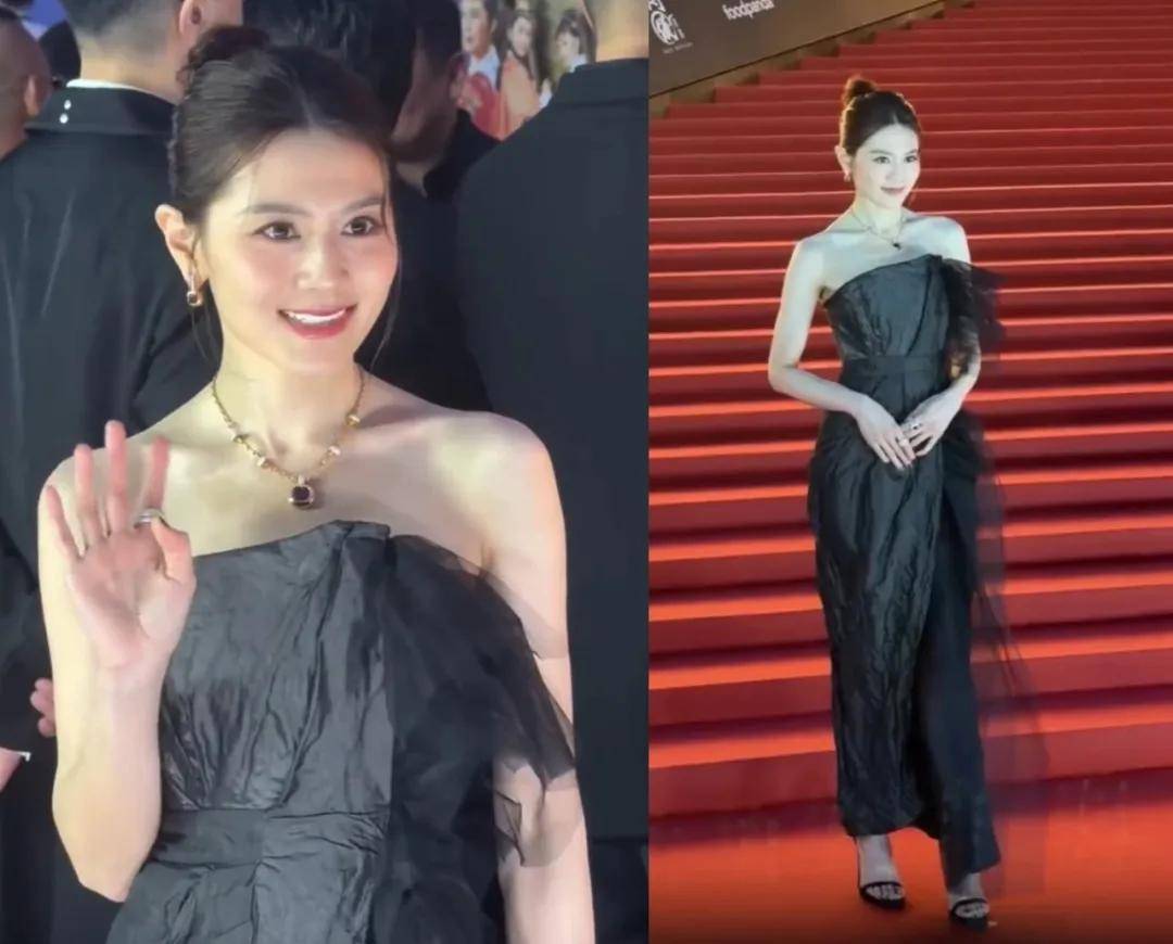 郭羡妮近几年已经很少拍戏了,但还是有在进行外形管理的,美貌依旧,就是这条黑色抹胸长裙有点难懂,有些角度看起来会显胯宽,有些角度则会有肚子凸了出来的错觉。